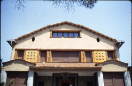 Detall del cos superior de la façana principal.