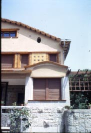 Detall de la façana i la pèrgola de la terrassa.