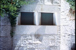 Detall de la part baixa del mur, amb revestiment de pedra, amb les finestres del soterrani.