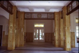 Perspectiva del hall de la casa. A la imatge són visibles el revestiment ceràmic i els vitralls.