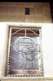 Detall de la finestra, amb reixa de forja, i revestiment ceràmic que flanquegen la porta principal.