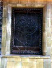 Detall de la finestra, amb reixa de forja, i revestiment ceràmic que flanquegen la porta principal.