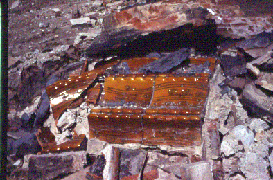 Detall d'un fragment de la ceràmica que recobria la façana d'Athenea entre les runes de l'enderroc.