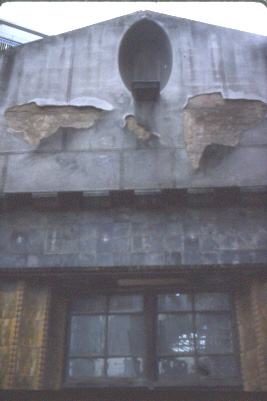 Detall del coronament i rètol de l'edifici poc abans del seu enderroc.