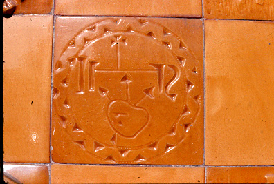 Detall d'una de les rajoles dels plafons ceràmics de la façana. La rajola del model "sagrat cor".