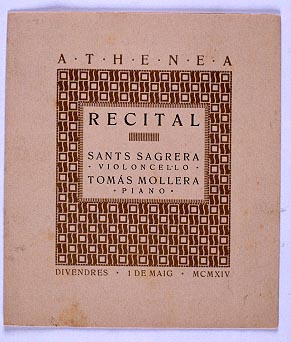 Programa de mà del Recital de Sants Sagrera, violoncel, i Tomàs Mollera, piano, celebrat a Athenea l'1 de maig de 1914. Programa dissenyat per Rafael Masó.