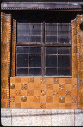 Detall de la ceràmica que envolta una de les obertures de la façana.
