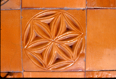 Detall d'una de les rajoles dels plafons ceràmics de la façana. La rajola del model "estrella".
