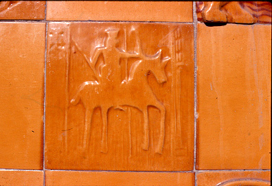 Detall d'una de les rajoles dels plafons ceràmics de la façana. La rajola del model "genet".