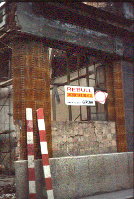 Instantània dels treballs d'enderroc de l'edifici d'Athenea l'any 1975. Detall de les columnes ceràmiques de la façana abans de l'enderroc. A la imatge es pot apreciar que les rajoles del plafó ceràmic ja han estat arrencades. Aquestes rajoles actualment es conserven al Centre Cultural de Caixa de Girona - Fontana d'Or.