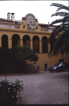 Perpsectiva de la galeria d'arcades i el rellotge de sol de la façana.