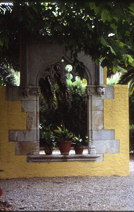 Detall d'una finestra gòtica, de procedència desconeguda, muntada en el jardí com a element de decoració.