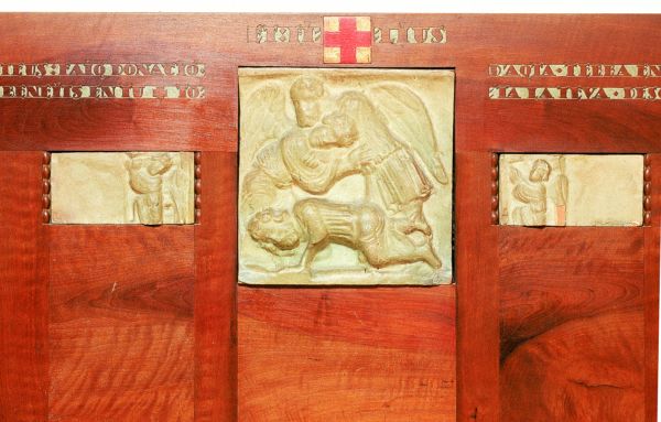 Detall del llit dissenyat per Rafael Masó, amb relleu escultòric de Joan Baptista Coromina, per al seu domicili. Imatge presa en la seva ubicació actual.
