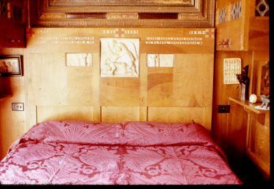 Detall del llit dissenyat per Rafael Masó, amb relleu escultòric de Joan Baptista Coromina, per al seu domicili. Imatge presa en la seva ubicació actual.