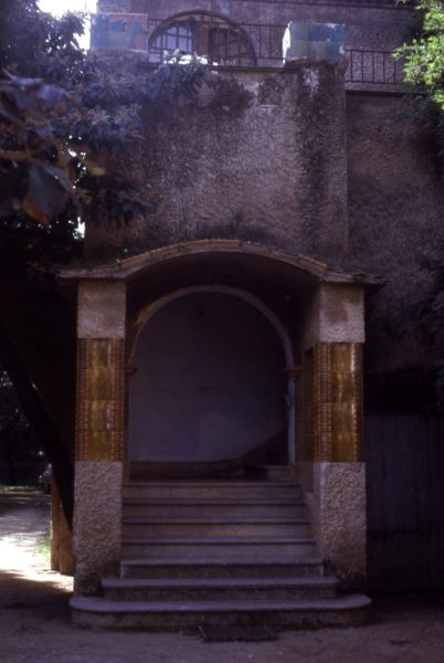 Vista de l'entrada a l'escala que dóna accés a l'habitatge. Les columnes ceràmiques que l'emmarquen són de l'obrador dels Coromina de La Bisbal.