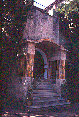 Vista de l'entrada a l'escala que dóna accés a l'habitatge. Les columnes ceràmiques que l'emmarquen són de l'obrador dels Coromina de La Bisbal.