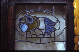 Vitrall amb el motiu del peix, realitzat al taller Rigalt-Granell de Barcelona
