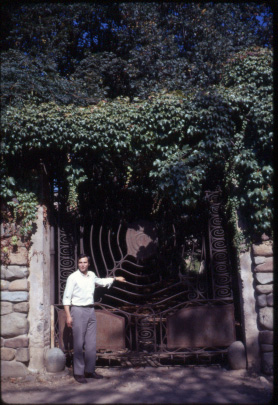 Vista de la portalada d'entrada al jardí. La porta, de forja, és obra del serraller Nonito Cadenas.