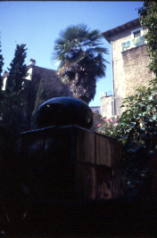 Detall d'una de les boles de ceràmica vidriada verda sortides de l'obrador dels Coromina de La Bisbal, que decoren diversos indrets de l'exterior de la casa.