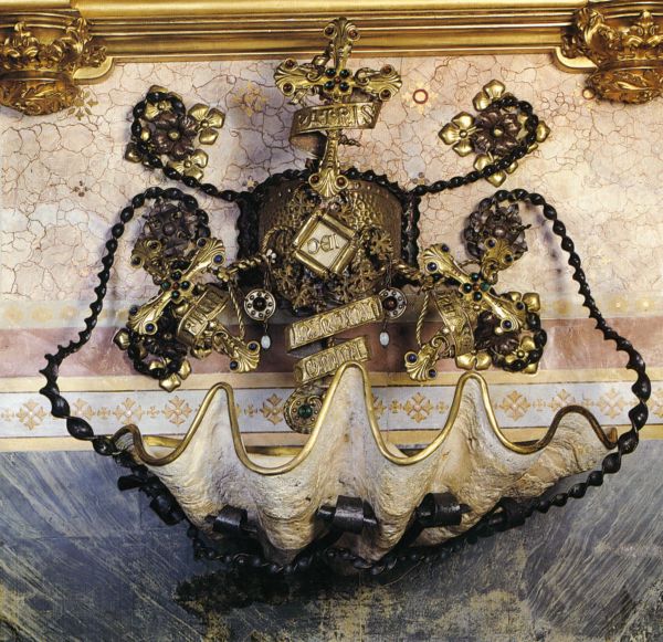Pica per aigua beneita realitzada amb una curculla gegant ornamentada amb orfebreria.