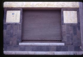 Detall d'una de les finestres i del plafó ceràmic que l'envolta.