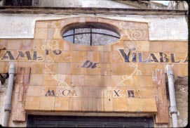 Detall del rètol ceràmic realitzat per Joan Baptista Coromina a l'obrador La Gabarra de La Bisbal.