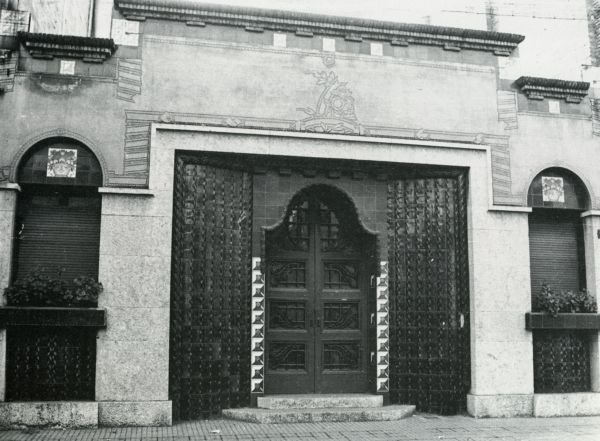 Perspectiva general de la façana, on s'aprecia el treball de ceràmica, esgrafiats i forja.