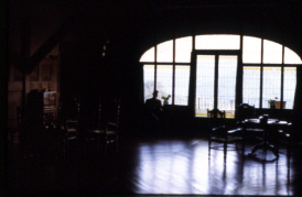 Vista de l'interior de la sala d'estar amb el vitrall i mirador al fons.