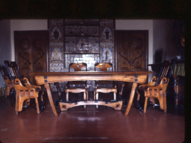Menjador del Mas El Soler amb la taula i les cadires dissenyades per Masó i realitzades per l'ebanista Miquel Pràtmans, a primer terme.