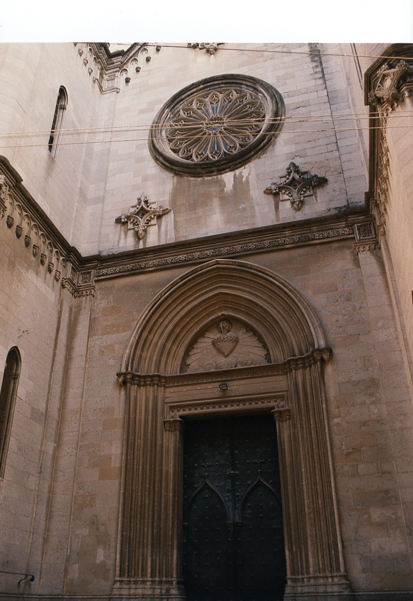 Vista de l'entrada principal de l'esglèsia, entre els dos campanars, i de la rosassa.