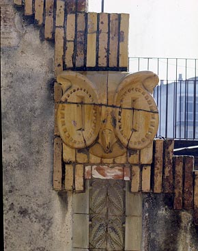 Detall del coronament ceràmic de la Casa Batlle, amb els mussols que la caracteritzen.