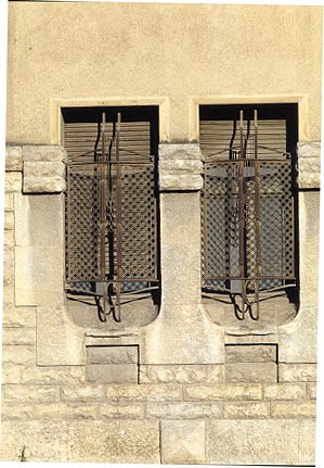 Detall de les finestres de la planta baixa amb la característica reixa amb el motiu de l'espiga.