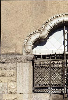 Detall de les finestres de la planta baixa amb la caracterísitica reixa amb el motiu de l'espiga.