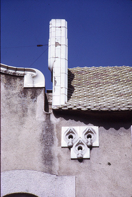 Detall de l'exterior amb la ceràmica vidriada blanca que caracteritza l'edifici.