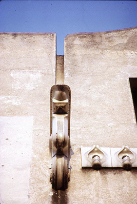 Exterior detall de les gàrgoles en ceràmica vidriada blanca.