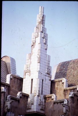 Detall del pinacle, en ceràmica blanca, que sobresurt de la coberta del cos d'habitatge.