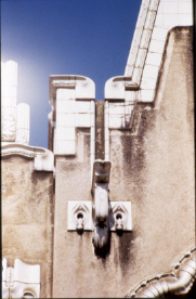 Detall del coronament de l'edifici amb les gàrgoles ceràmiques a primer terme.