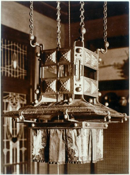 Detall de la làmpada del menjador de la Casa Masó. El disseny és de Rafael Masó i el brodat de les germanes de l'arquitecte i Esperança Bru.