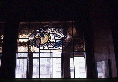 Detall d'un dels vitralls, el del peix, de la galeria del tercer pis.