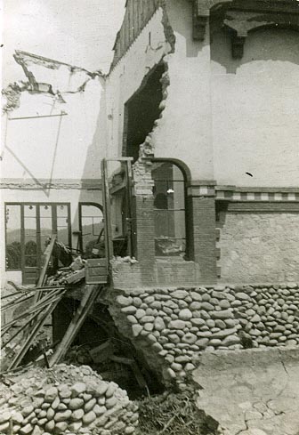 Vista de l'edifici durant l'enderroc de la terrassa i marquesina construïdes per Josep Esteve l'any 1943.