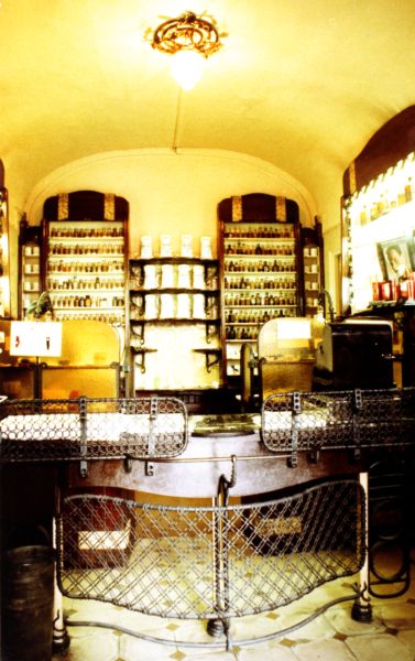 Perspectiva de l'interior de la farmàcia que permet apreciar el treball de serralleria de les prestatgeries i baranes, el taulell i els pots ceràmics, dissenyats per el propi Rafael Masó i realitzats pel ceramista d'Olot Antoni Serra.