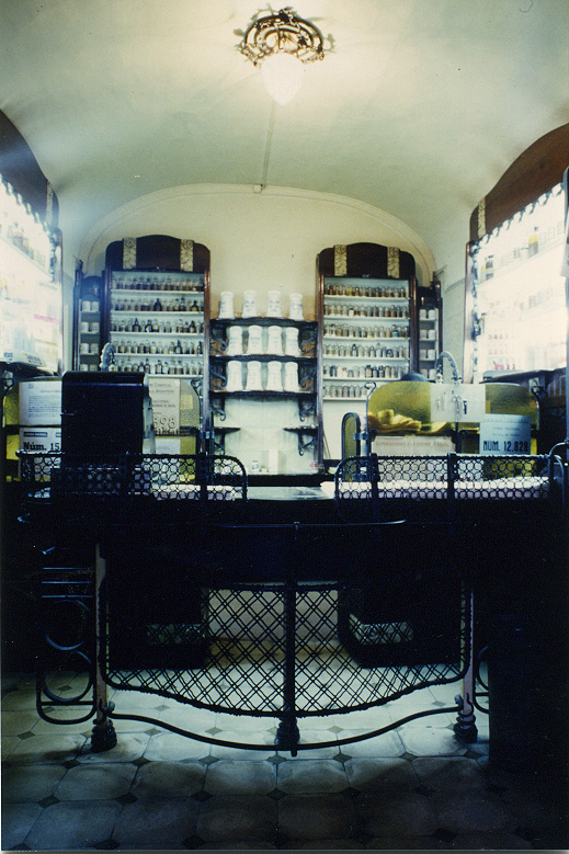 Perspectiva de l'interior de la farmàcia que permet apreciar el treball de serralleria de les prestatgeries i baranes, el taulell i els pots ceràmic, dissenyats per el propi Rafael Masó i realitzats pel ceramista d'Olot Antoni Serra.