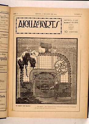 Portada del núm. 8 de la revista Aiguaforts amb un acudit referent a la Farmàcia Masó Puig. En aquest dibuix es pot veure la façana projectada i realitzada per Rafael Masó, que va desapareixer amb la reforma de Roca Pinet de l'any 1935.