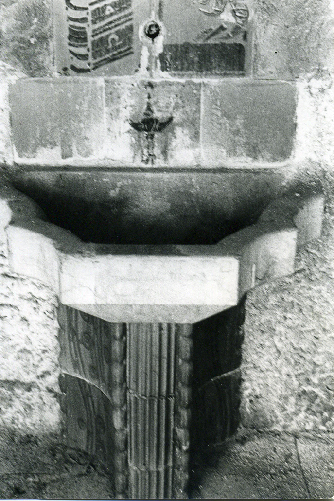 Detall d'una font on es pot apreciar la ceràmica de l'edifici.