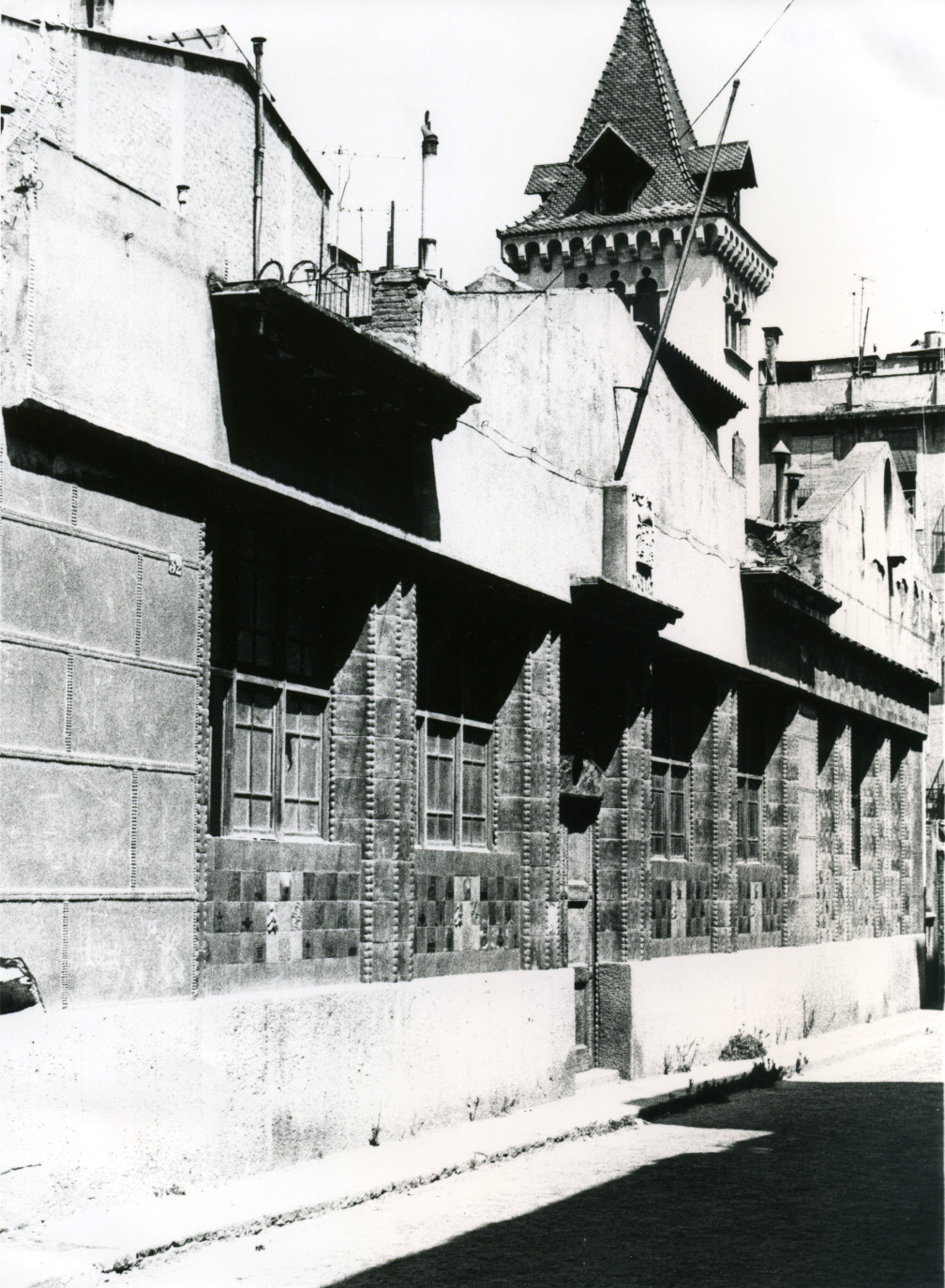 Vista del conjunt format per la façana de l'Escola d'Arts i Oficis, oberta al carrer Anselm Clavé, i l'edifici d'Athenea. La imatge no té data però, ha de ser posterior a la reforma efectuada acabada la Guerra Civil, i que suposa el trasllat de la porta d'Athenea a l'edifici de l'Escola d'Arts i Oficis.