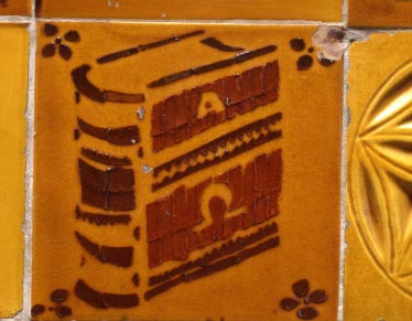 Rajola ceràmica amb el motiu del llibre, que provinent de l'Escola d'Arts i Oficis es conserva des del seu enderroc al Centre Cultural de Caixa de Girona (Fontana d'Or).