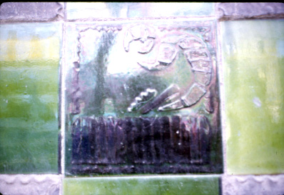 Detall de les rajoles de la façana a la Gran Via Jaume I.