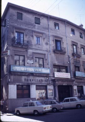 Perspectiva general de l'edifici la primera planta i baixos del qual Rafael Masó reformà l'any 1920 per ubicar-hi la seu del Banc de Terrassa i, tres anys després, l'adaptà com a seu del Banc Urquijo Catalán.